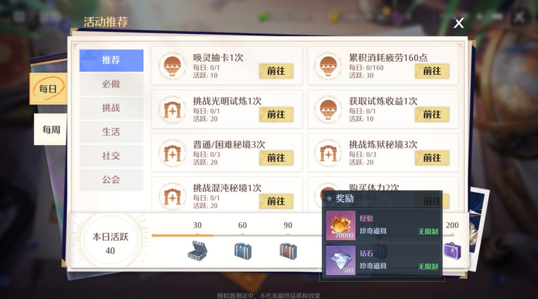 光明试炼是冒险家们日常获得经验和资源的重要途径之一,爬塔的层数越高可以获得挂机资源就越多,而在爬塔过程中每通关特定的层数都可以获得首通钻石奖励。第一天获得1000钻石还是没有压力的。