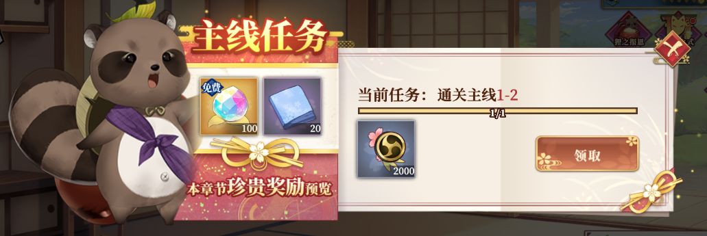 【御殿】界面点击【出战】按钮,上方的气泡即可进入主线任务界面。完成主线任务可获得依代、日之灵、蓬莱玉(免费)、命盘、棉布、训练点及训练点上限提升等丰厚奖励哦!