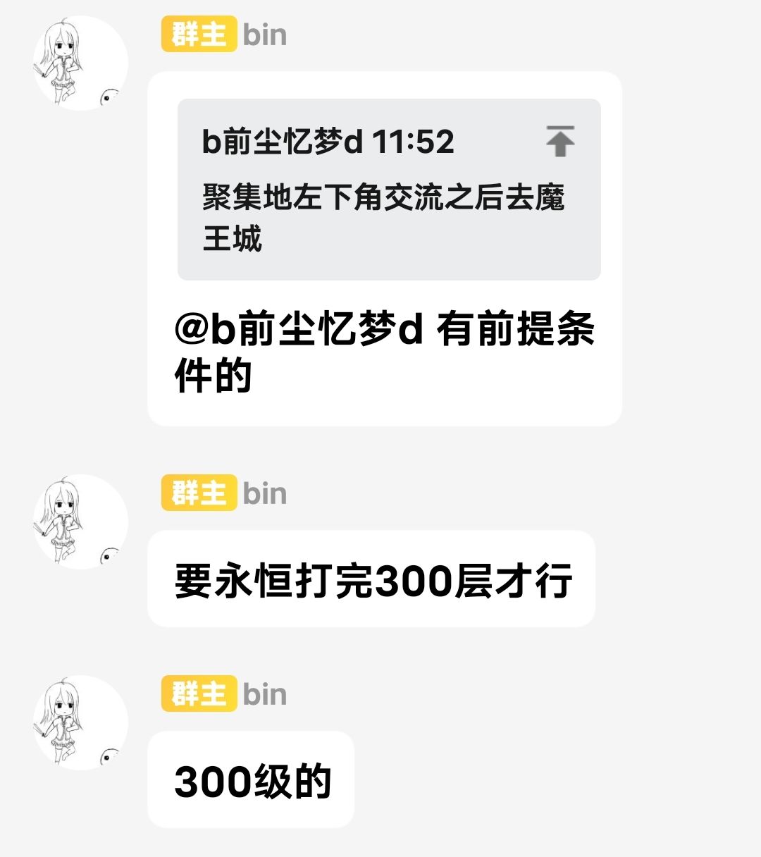 注(深渊迷宫解锁条件,300层永恒,去人类聚集地左下找头上有感叹号的NPC对话,再去魔王城找魔王抓住他,再用圣光打死,当然你也可以不抓他直接打死,迷宫就解锁了)