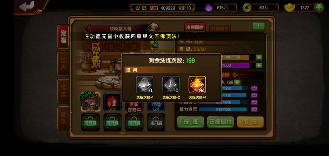 洗练宠物需要足够的洗练石和天赋果哦,洗练石和天赋果可以从商店、探险、斗宠商店里面获得哦,用天赋果洗练的宠物是随机重置属性(我们习惯将攻击敏捷洗到近满才用哦。)天赋果是将宠物洗回初始一级,这里我们要注意,不要等宠物升阶升级后再洗练哦,不然回到一级那可就欲哭无泪了。