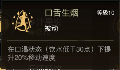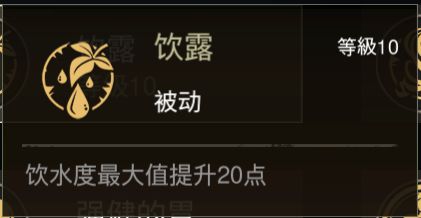 2. 生存类生存类技能能够通过影响饱食度、饮水度等指标,来提高玩家在非战斗状态下的生存能力,在游戏过程中,老胡建议至少应激活并应用其中一种技能。