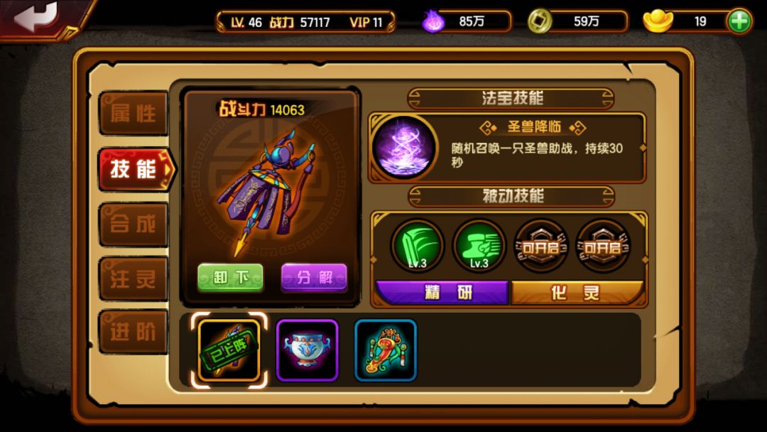 使用后随机召唤一只圣兽(朱雀,玄武,白虎)助战,持续30秒