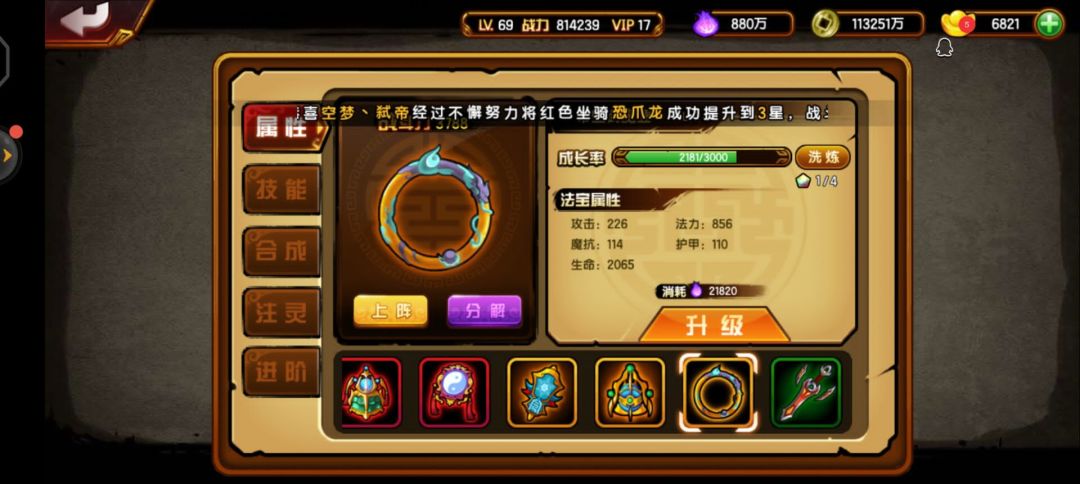 生命成长:30-70、法力成长:7.5-17.5、攻击成长:10.5-24.5、护甲成长:7.5-17.5、魔抗成长:7.5-17.5