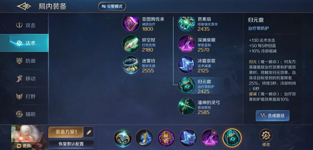 华佗作为一个辅助英雄,出装偏向于功能性(而非肉或输出)。辅助装增强加血能力和移速,鞋子选更利于支援的,第3/4装备使他的任何伤害技能都能减速敌人5秒,法力源泉增加续航能力和冷却减免,最后一件装备增强治疗量和减伤。