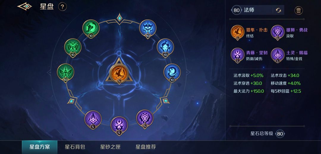 星盘我推荐这套法师穿透常规星盘,本套星盘的最大亮点是法系通用的同时兼顾 回蓝、吸血、移速、冷却、减伤,全面提升华佗的作战能力!