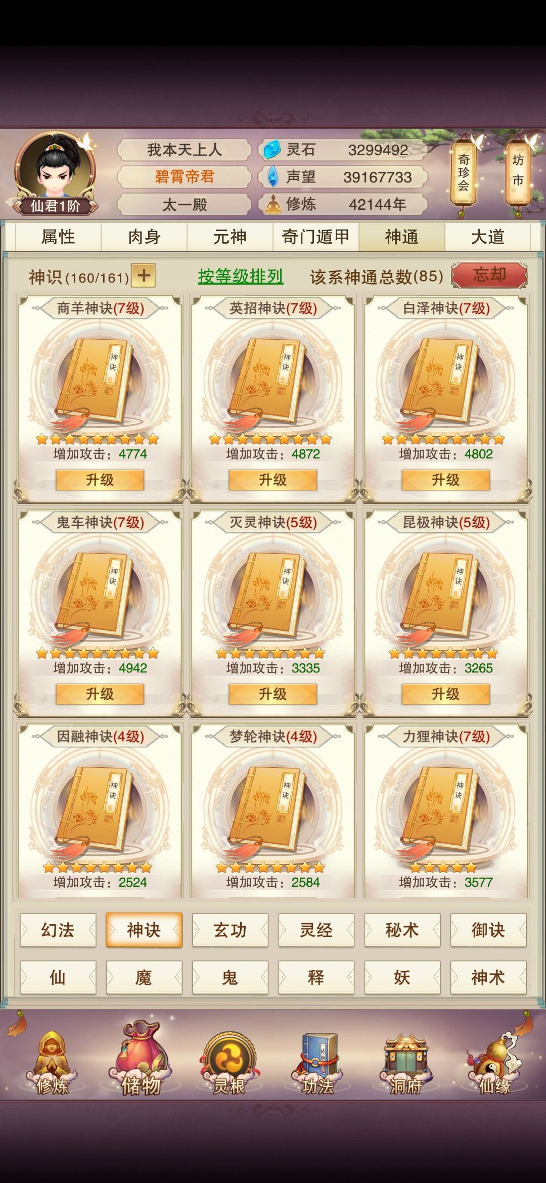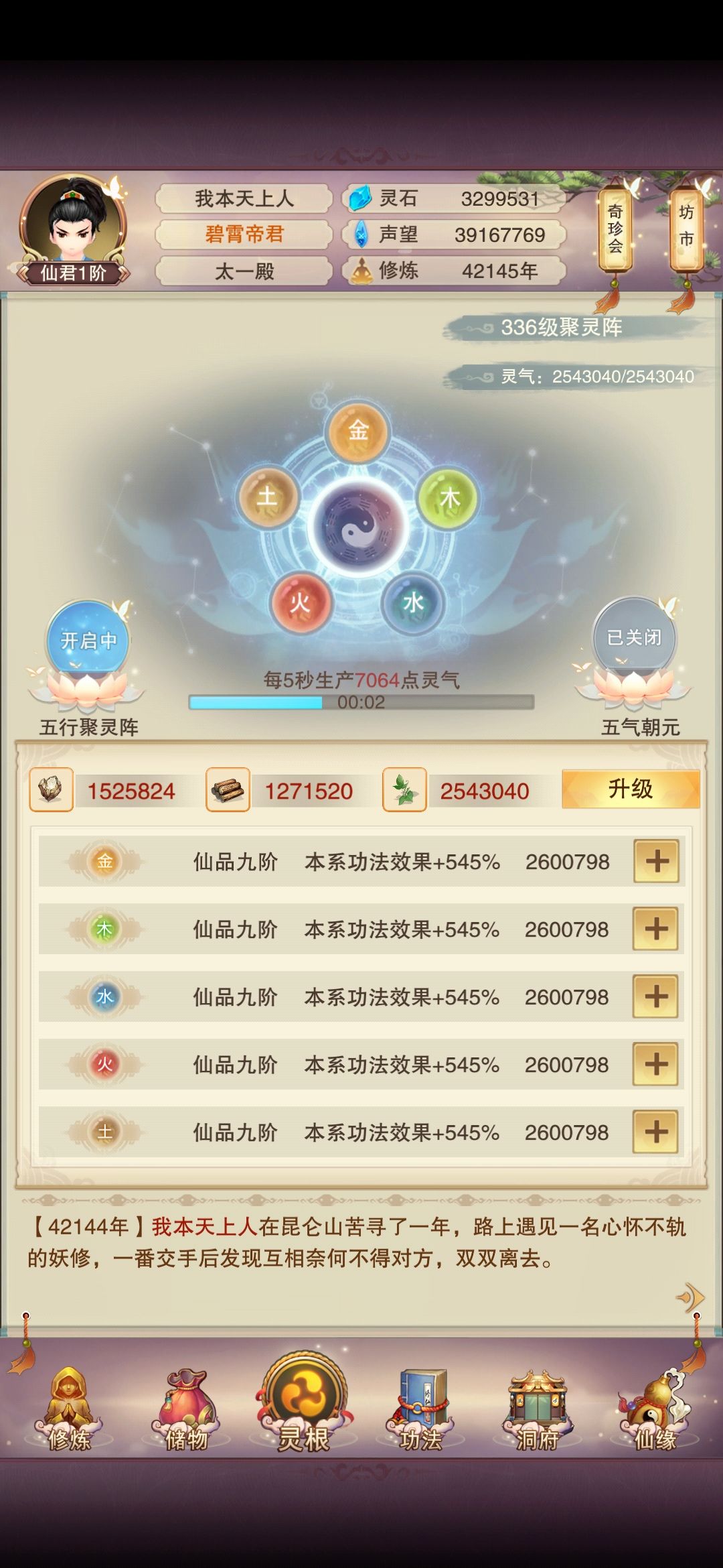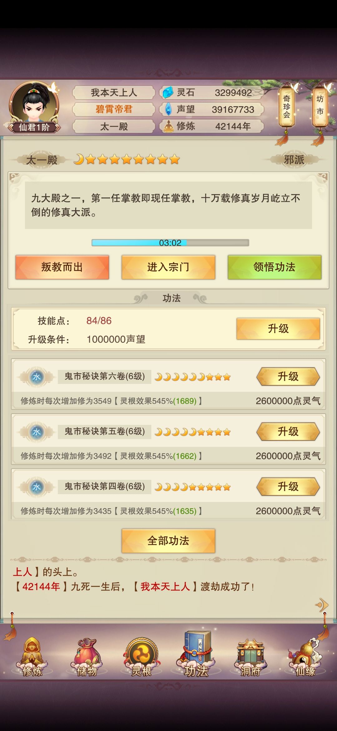 玄仙之后都在补天秘,现在69一跳了,339之前应该可以百万防御,门派在挂阵法,玄仙门派还有一个没进,隐世进了两个六星,人间道也快圆满了,望仙楼90没去偷但是也快了,混沌海道图一层加二层的一副,补的晚所以混沌之力不高,攻击神通5-7没氪,不过有一说一,神识碎片真的缺,我把4星以下真伤真防全忘了都不够。