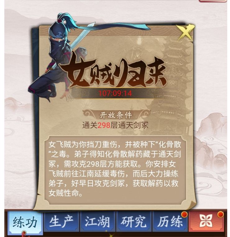 攻克了通天剑冢获得解药后,小女贼就会进行一段疗伤期,疗伤结束后就会开启后山小筑。正式开启少年侠客的养成计划。