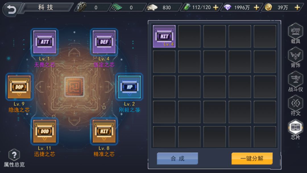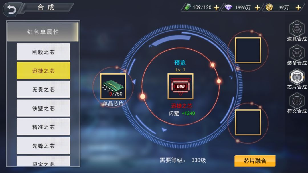 芯片出了升级,还有一个重要的玩法就是芯片的合成,这里不仅仅是双属性芯片的合成,我们还可以单属性芯片合成,甚至还有超融合属性芯片合成,这里的超融合就是两个双属性芯片的融合。单属性芯片的合成直接解决了最根本的需求,让我们可以随意拥有自己需要的基础芯片,而超融合则是大大的提升了角色的属性,这也是芯片系统独特的地方。也配的上我们整个科技系统的压轴大作。
