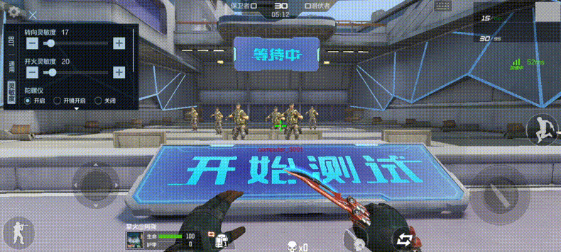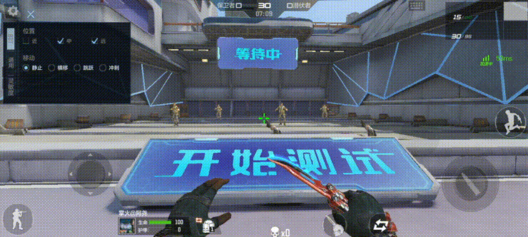 在进入模式后,可以看到左上角有一个设置面板,内容有BOT、通用和灵敏度三个设置选项。BOT设置可调整人机的位置和移动状态,位置包括“近、中、远”,移动状态则包括静止、横移、跳跃和冲刺,不同组合模拟了不同的人物场景。