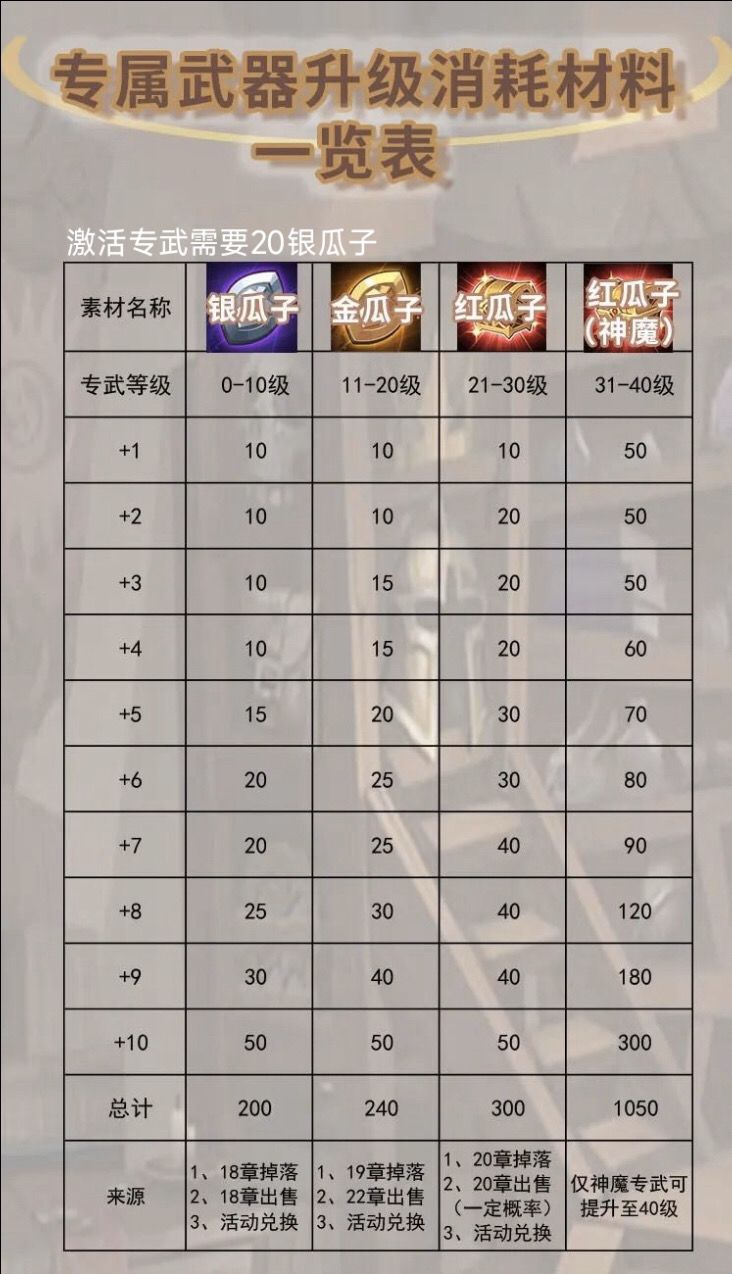 专武升阶需要瓜子数(激活专武额外需要20银瓜子,等于是升到专10需要220银瓜子)