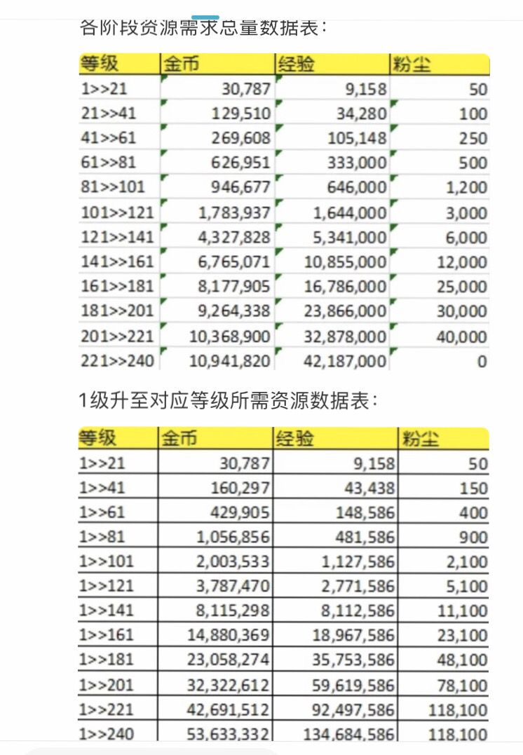 240级前单个英雄升级所需(数据有点老,希望莉莉丝没改)