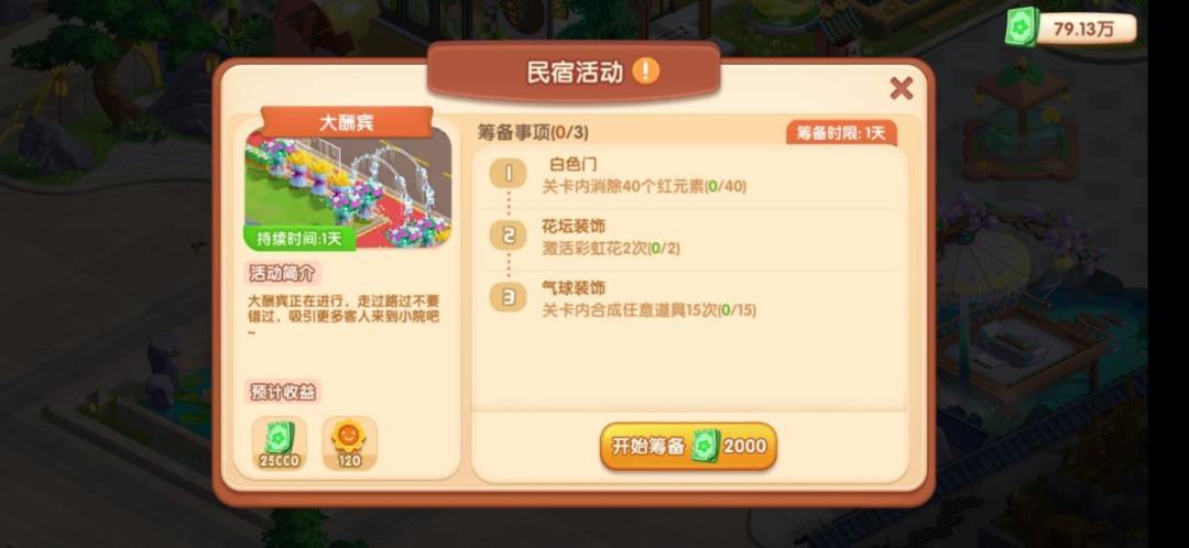 3、创造师们可以参加民宿大酬宾活动,投入启动资金2000现钞后,就有机会获得10倍以上的现钞收益额,快来踊跃参与吧!