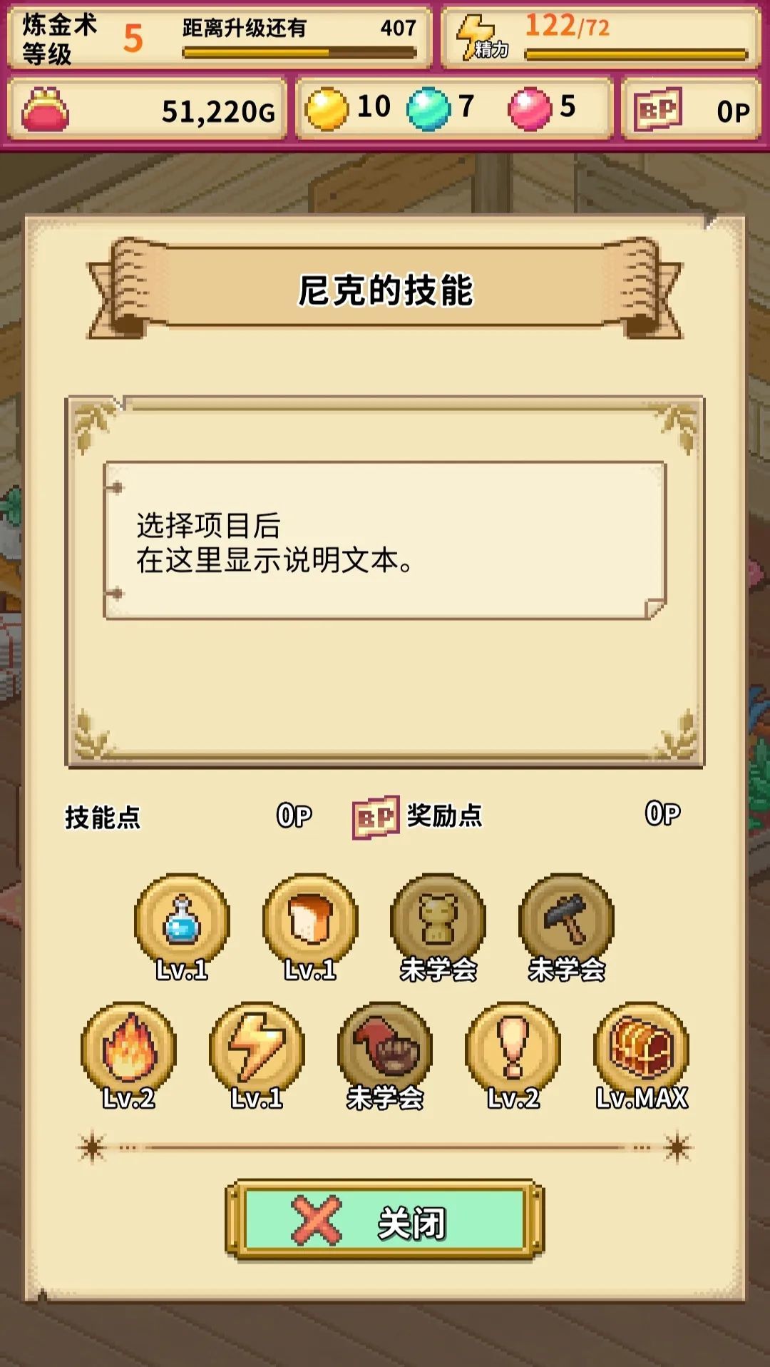 在自家的界面,我们还可以提升“尼尔”的炼金术技能的水平,每次升级和完成相应的任务,能够获得1点技能点,技能点可以用来升级相应炼金技能。