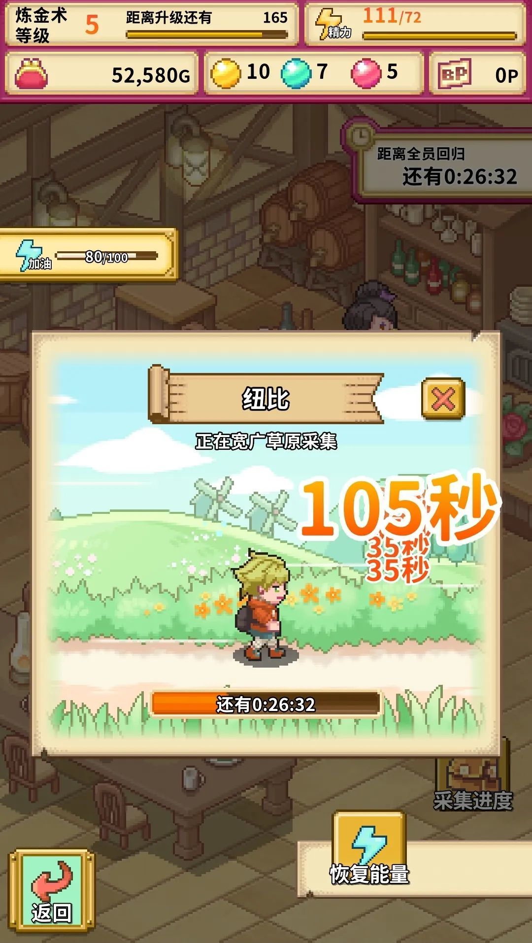 安排纽比去相应森林采集物品之后,我们可以点击纽比,打开查看纽比的采集进程,而点击这个界面我们可以减少纽比的采集时间,每点击一次消耗1点加油能量。需要注意的 是,千万不要点击右上角的叉叉,那会取消这次的采集!
