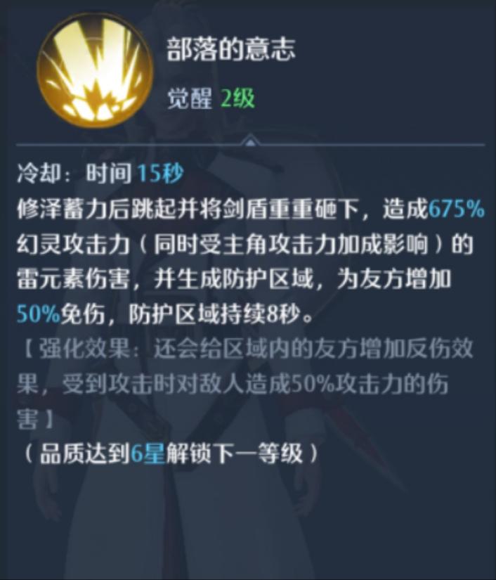 推荐技能释放顺序:先使用特技技能二【疾风斩】拉近范围内所有敌人,然后使用觉醒技能【部落的意志】,在造成元素伤害的同时,还能增加一定的免伤,接着用特技技能一【无畏盾击】对敌人造成伤害,顺便给自身增加防御。