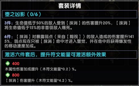 橙色技能【抹消】对血量低于50%的敌人造成的伤害提升20%(请注意,此加成的算法为易伤)当【抹消】击中15%血量以下的非首领敌人(小怪和精英)时,会直接秒杀对方