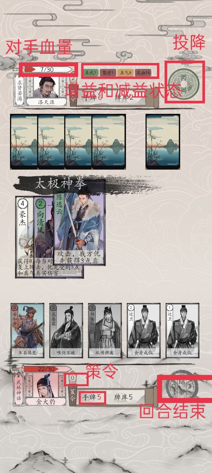 增减益状态:江湖阵营(通用卡牌)有流血(对方开始回合受到一点伤害)中毒(对方结束回合受到一点伤害)纠缠(对方需打出超过该层数的伤害才能对敌方造成伤害)谋害(若此手牌在对方手中不打出每回合对方受到2点伤害)或乱:(若此手牌对方不打出每回合损失一点伤害)等等