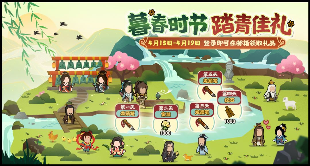 活动持续5天,王上们只需每天登录,即可领取龙须笔、金兰和纹石等奖励。机不可失,请调好闹钟哦!(奖励通过邮件发放)