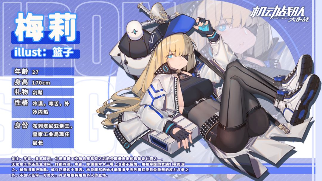 新机师【梅莉】:剑士,学者,皇家顾问,也是皇家工业局自里希特之后的帝国最杰出的机体设计师之一。无论是工作还是生活中,她都冷淡,毒舌,即便面对女王嘴上也毫不留情。她被帝国的贵族们敬而远之,却依旧我行我素。或许正是这个原因,地位超然的她才能置身于布列塔尼亚日益激烈的权力斗争之外,不加入任何一方势力,冷淡地维持着局外人的立场。