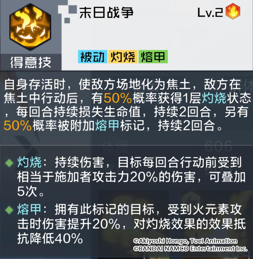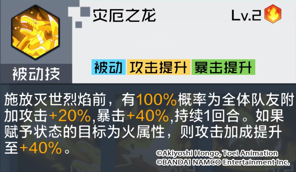 通过技能解析可以看出,游戏内灭世龙兽拥有独特的技能属性,通常技和奥义技皆可对敌方全体造成伤害,同时还有概率为目标附加灼烧状态。得意技更是能够将战场化为焦土,为敌方附加灼烧状态与熔甲标记,使目标持续损失生命值并提升己方火属性伤害。被动技可提升己方全体的攻击力与暴击属性,火属性目标更是能够获得额外的攻击加成。可以说是非常强大的输出类型数码宝贝,相信灭世龙兽在队长的阵容编队里会有不错的表现!