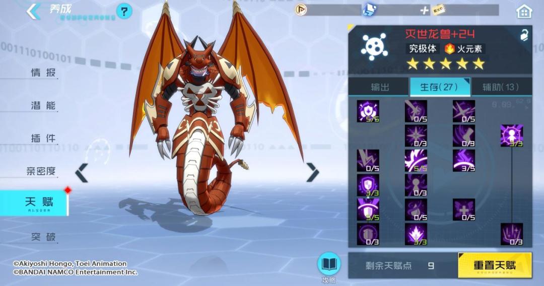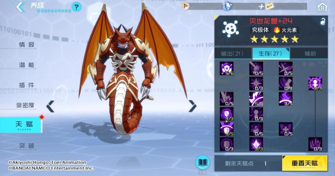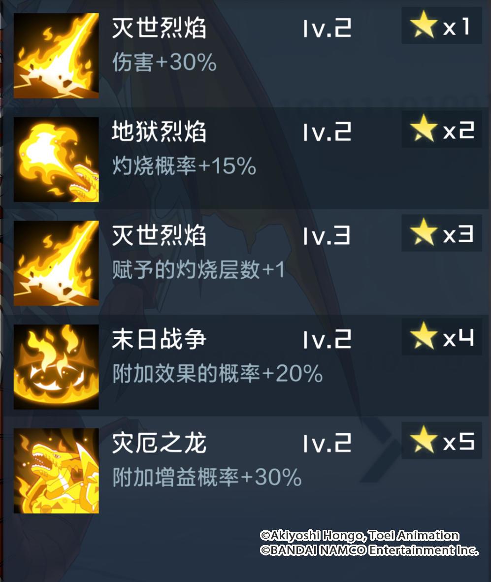 推荐理由:最大化提升生命值上限来加强自身的生存,以此持续发挥光环的灼烧效果,并通过灼烧与其它火属性数码宝贝产生更好的技能搭配效果。