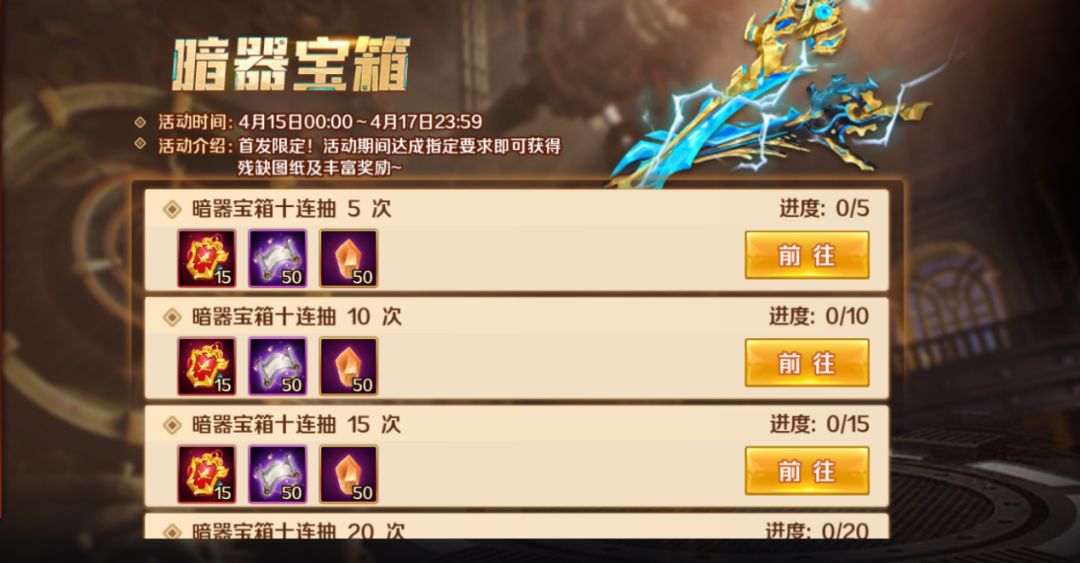 暗器宝箱活动中抽取暗器宝箱达到一定次数,即可获得残缺图纸、SS暗器兑换令等赠礼!