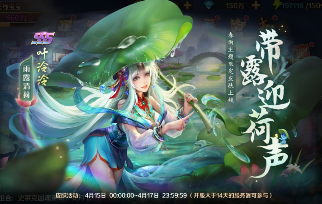 索托时装铺限时开业,累计充值达到指定额度即可获得SS+暗器碎片、仙品精粹等回馈!全新SSS神品皮肤 雨露清荷·叶泠泠 首发上线,春意渐浓,和她一起迎接这个春天吧~