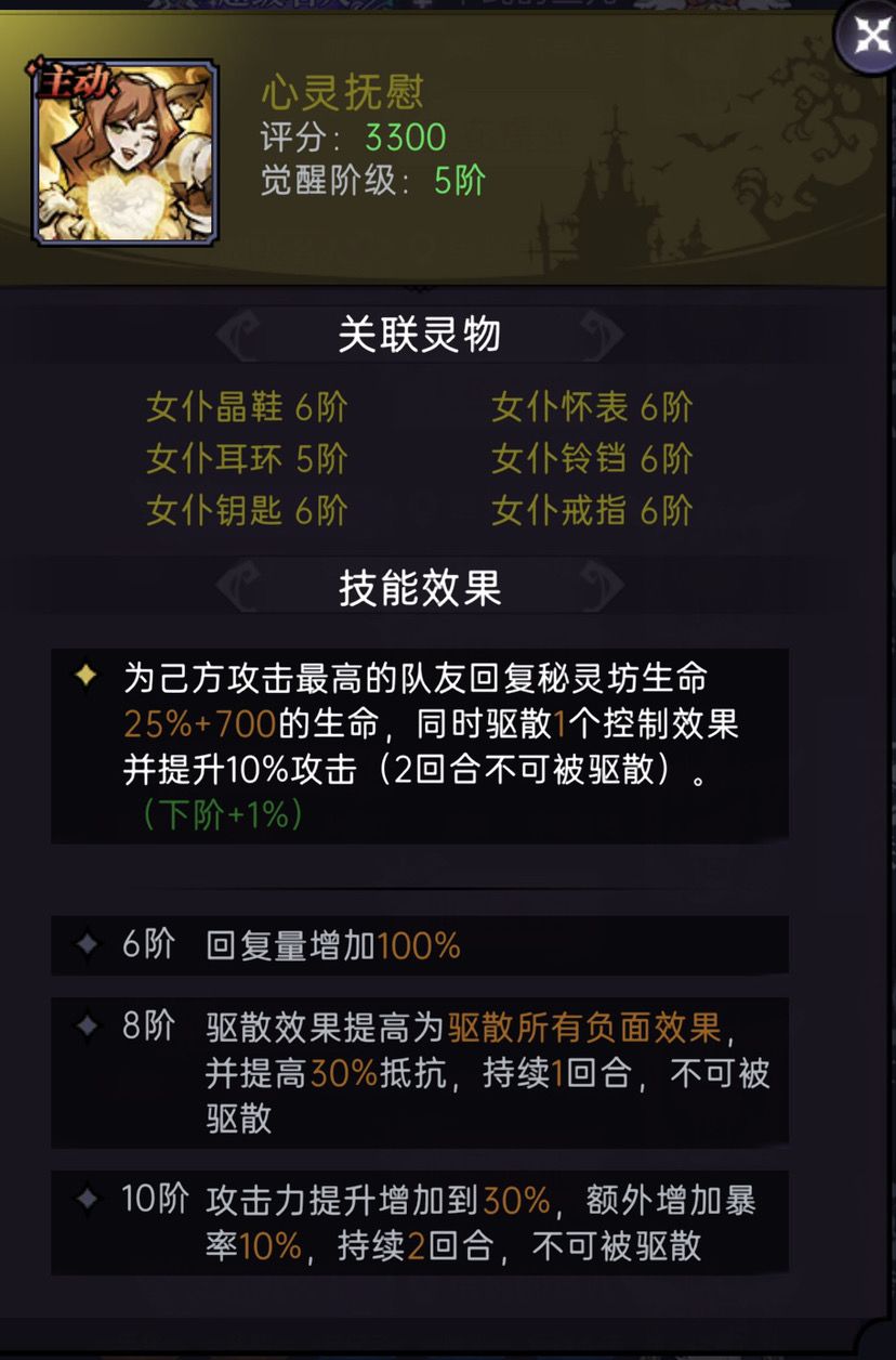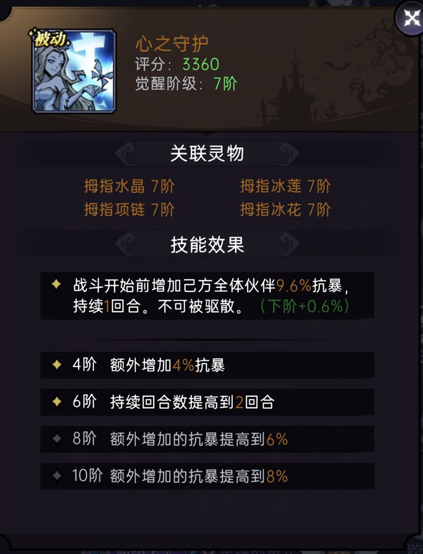 心之守护,加抗暴的被动灵物,10阶首两回合加15.4%抗暴,对上除了主流的章鱼队,降暴效果还算不错,不用刻意去升,