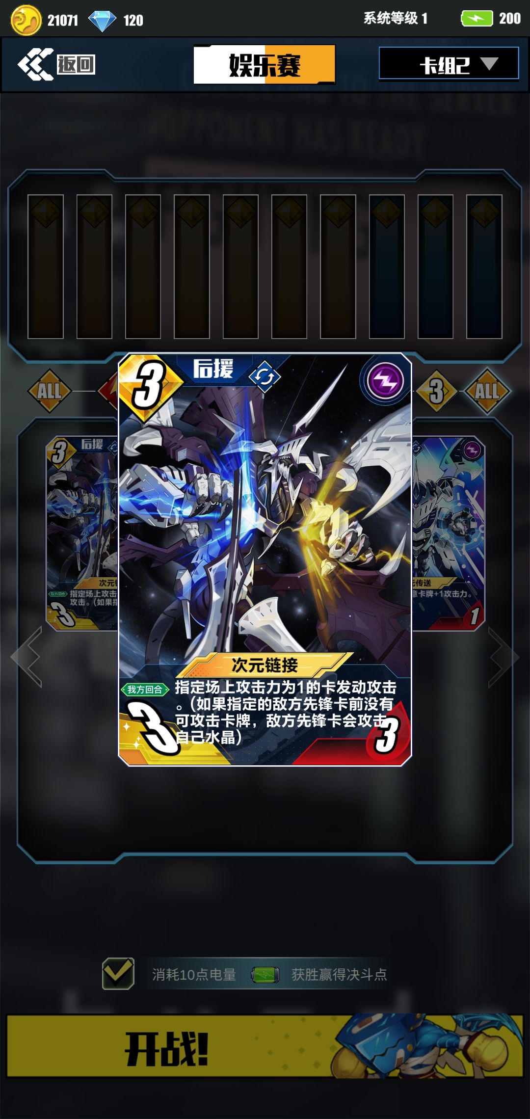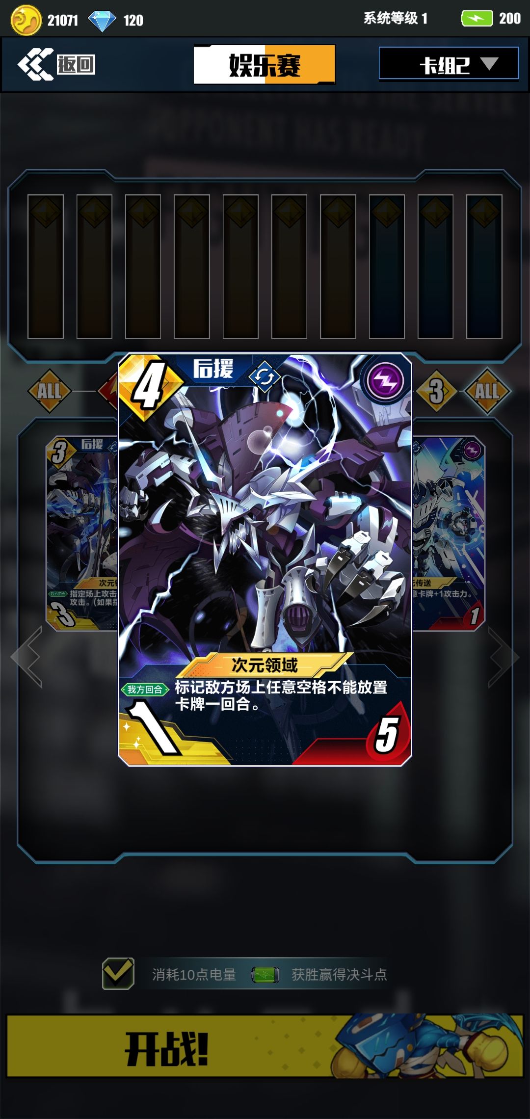 Tips:可用另外一张后援和 “次元传送”轮换,达到一回合多次增益我方卡牌的目的。