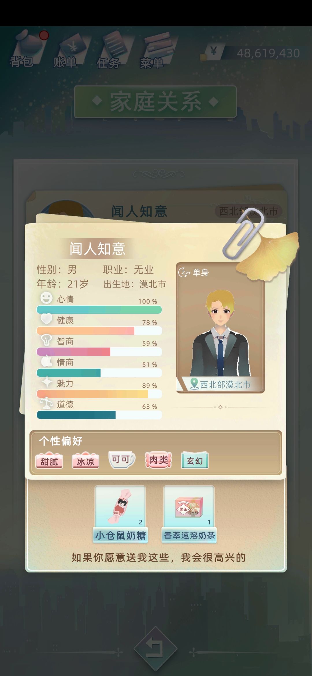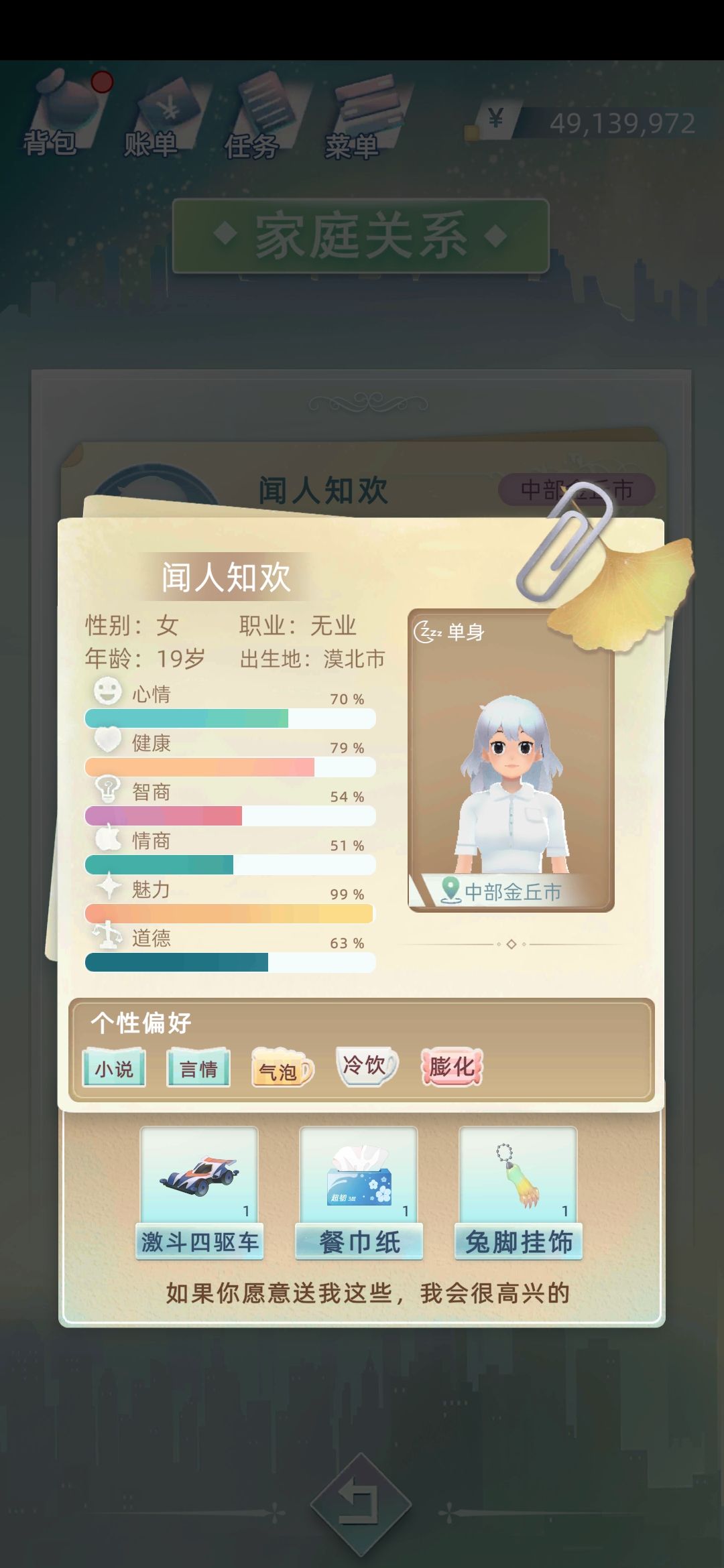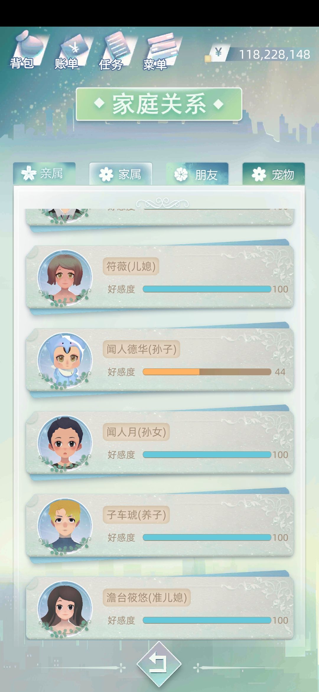 然后首先我带的星体是送青梅竹马的那个,众所周知,送的青梅竹马都姓牛,强调星体是想说,好像不用带培养子女的星体也能有效培养。