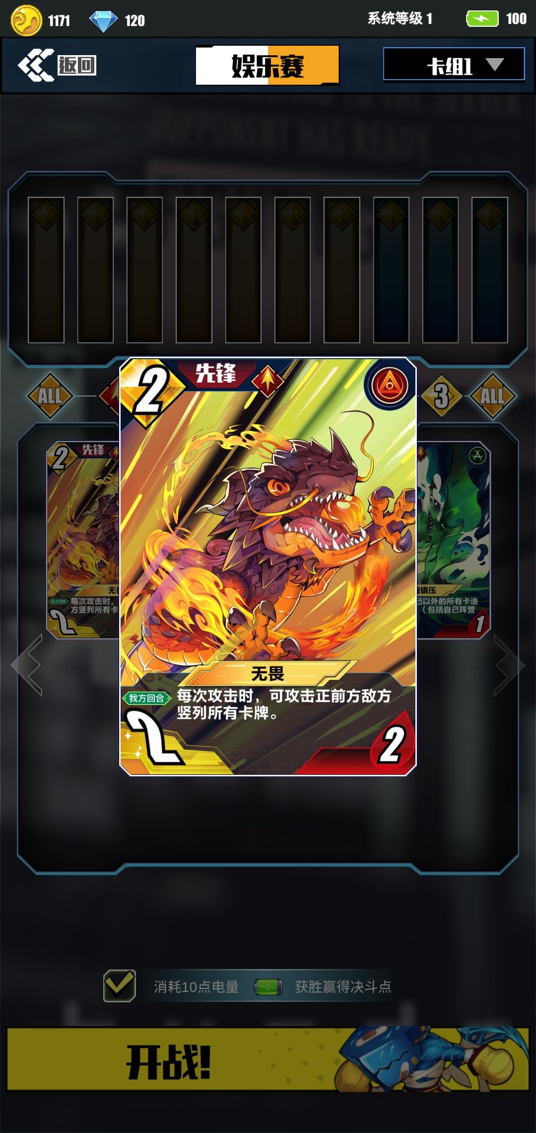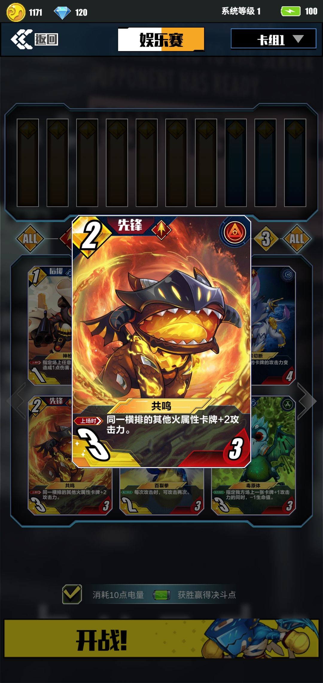 技能简介:登场时若场上(敌方和我方)至少存在2张火属性卡,增强2点攻击力。