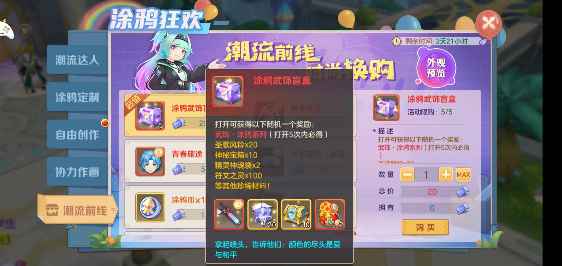 可在潮流前线页面中兑换时装青春旅途、涂鸦武饰盲盒、琥珀之灵、神话精灵百宝袋、时光彩钻等道具材料宝箱。(这次返场的青春旅途也是机会难得哦)
