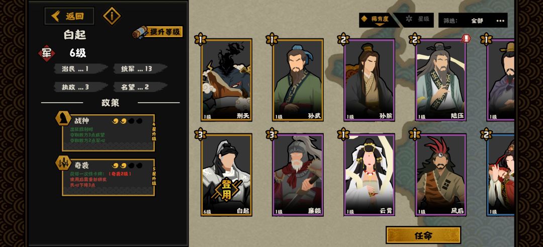 可以有调换,大致思路是借助白起被动以及庄子的循环技能保证民政属性稳定发展,技能如上图。