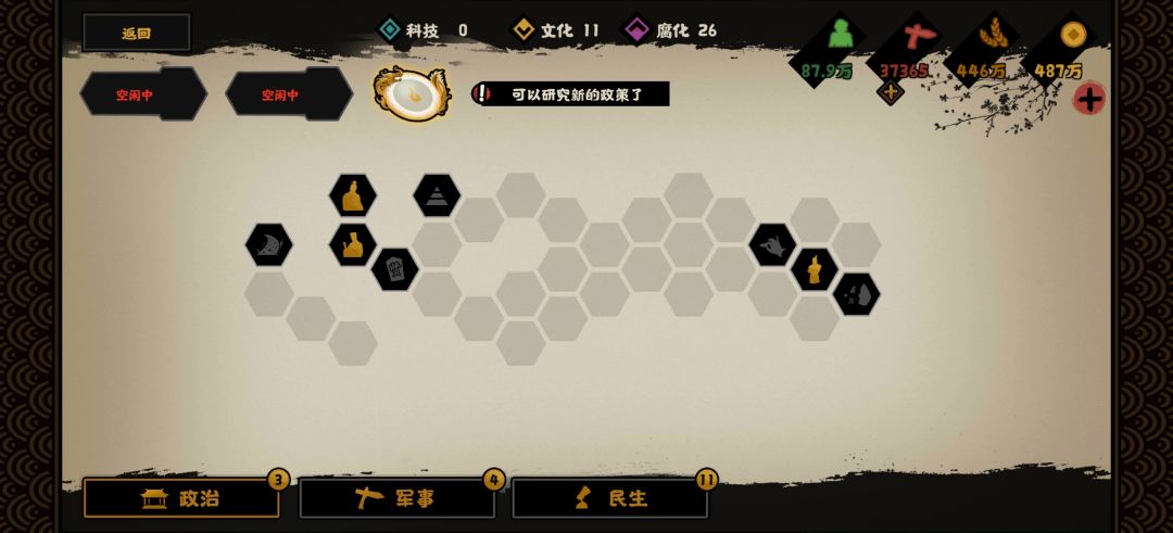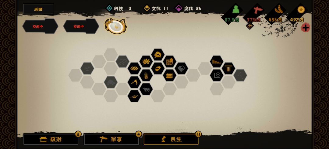 在科技为王的国战本中,要注意前期尽量不要大幅度点军事科技,会导致兵力消耗过大。要注意优先点产量类建筑,需要消耗民心军心的政策要尽量早点,这样损失最小。(损失量=城市数量*属性损失数)同样道理增加政策数值尽量可以往后推迟。