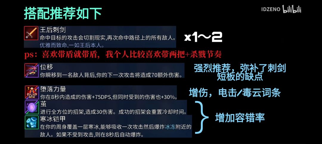 变异如果是一把刺剑的话就可以把杀戮节奏换成复仇(新手推荐)或者冷血无情,卷轴主紫副红,两把的话就是主紫副绿
