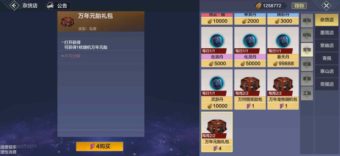 3.千年临时:千年临时狐狸,玄龟,翅膀大的鸟,这些买回去吞部位的还是挺多的,10勾一个,别看少,卖的多了也是能值一件开天装备的。
