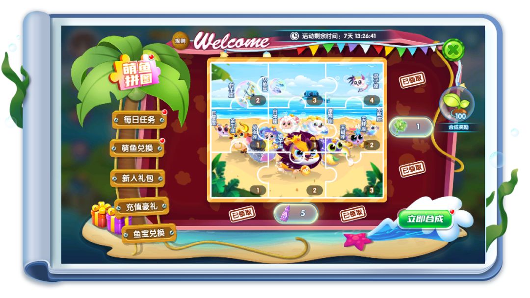 萌鱼拼图板块中点亮横线或纵线可获得连线奖励,点亮所有拼图可以合成萌鱼拼图,合成后将会得到100个【豌豆芽】,同时连线奖励也会刷新,馆长们多拼多得~