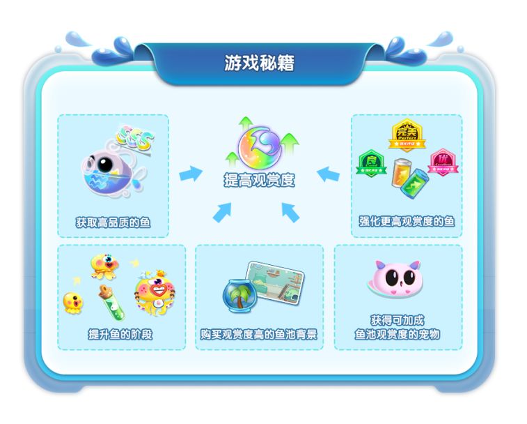 游戏中鱼儿观赏度是非常重要的,排行榜、水族馆的等级都与它相关;鱼儿的品质、阶级越高,它的观赏度也会越高~同时水族馆的整体观赏度也会上升~
