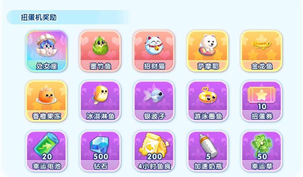 ① 扭蛋机产出的萌鱼也是馆长获得新鱼的主要玩法板块;可扭出SSS级处女座、活动限时鱼、SSS级金牛座的所需兑换的萌鱼。