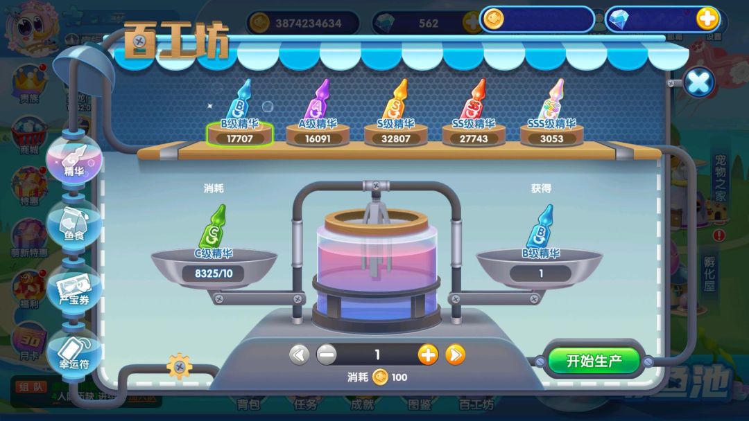 ①百工坊中精华、鱼食、产宝券、幸运符等游戏道具可以使用低级的道具加金币合成高一级的道具。