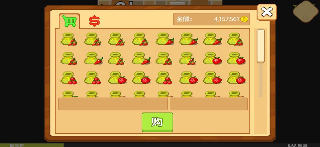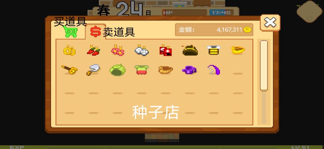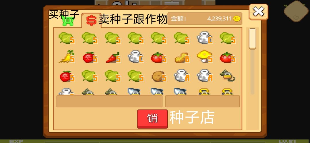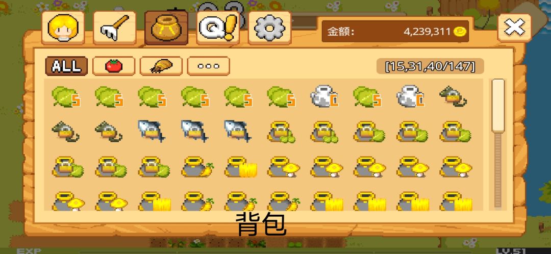 这个呢是作物,种子,跟一些其他东西(信封,龙珠,破轮胎,空碗面,蛇皮坑电)的背包,同样背包是有限的,49格,多余的东西依旧是卖给种子店老板娘哦