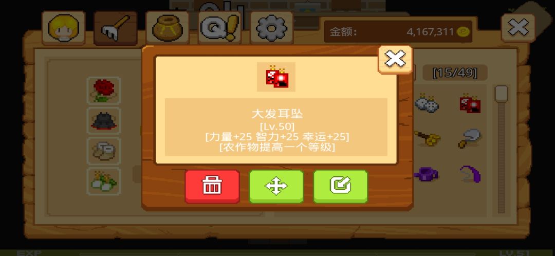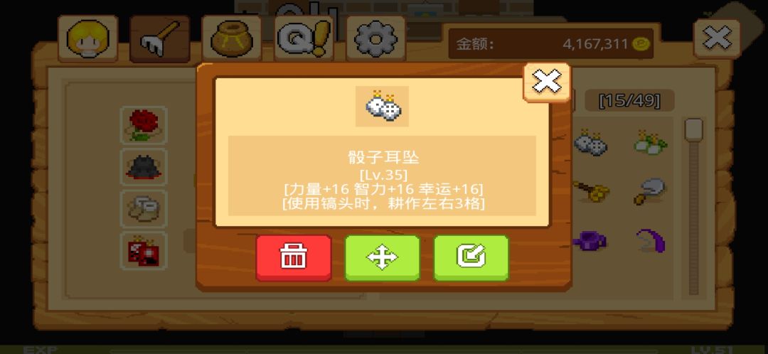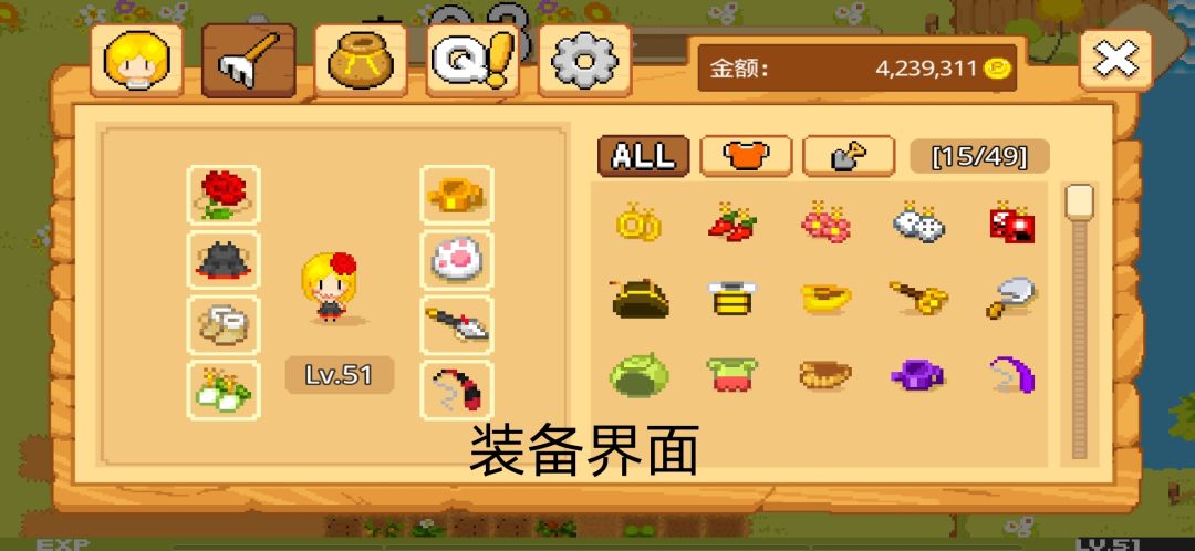 这个是装备栏,装备背包是有限的,只有49格,多余不需要的装备可以卖给种子店的老板娘哦