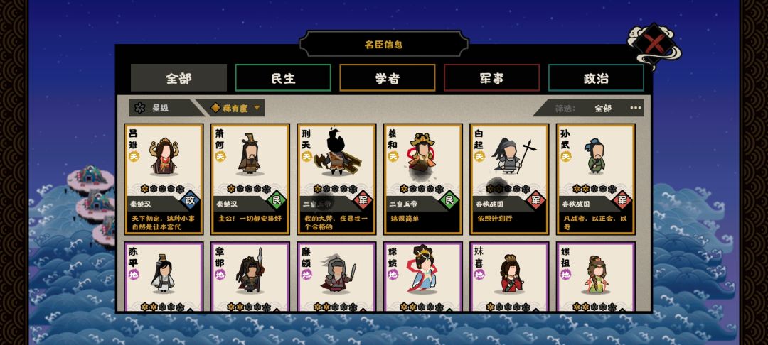 首先这一套对于初始名臣的选择还是很有要求的,硬性要求就是必须要有萧何与白起,萧何要达到三星。