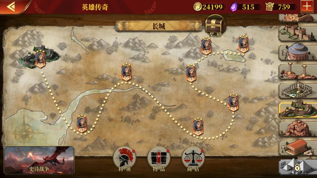 新增了英雄传奇章节“长城”、“佩特拉古城”,感受东方大秦帝国所建军事工程的宏伟和沙漠中神秘古城的繁华。完成对应关卡,可以获得战旗、装备和道具资源奖励。