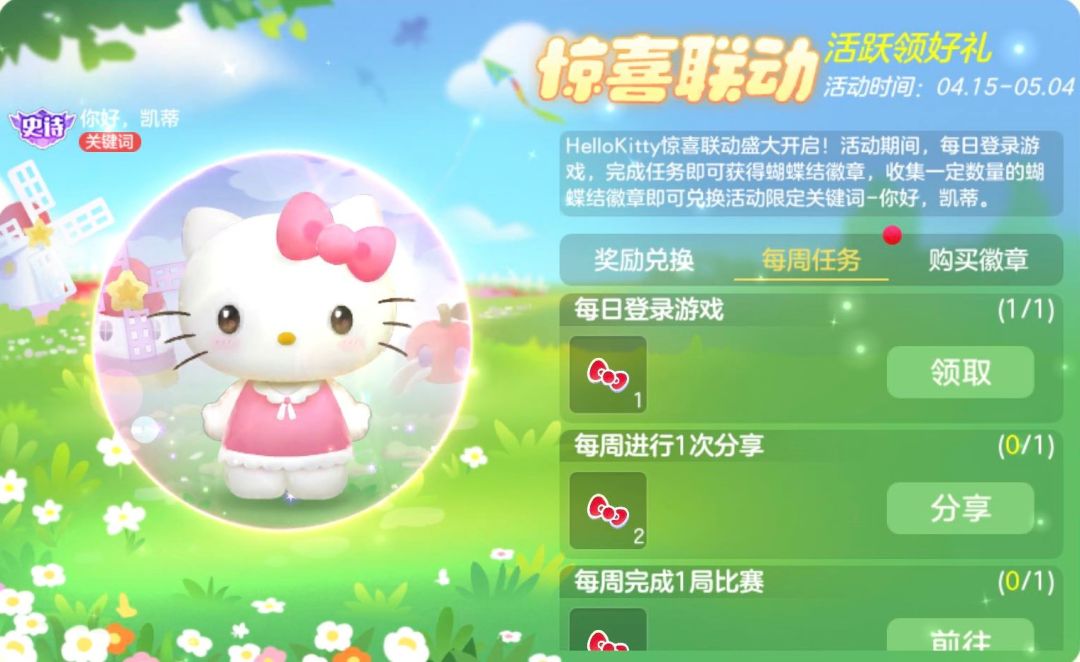 Hello Kitty喜欢收集各式各样美丽可爱的小装饰品,尤其喜欢蝴蝶结。快来完成任务,帮助Hello Kitty收集蝴蝶结徽章吧,它不仅是好朋友之间友谊的见证,还可以兑换联动限定皮肤哦。
