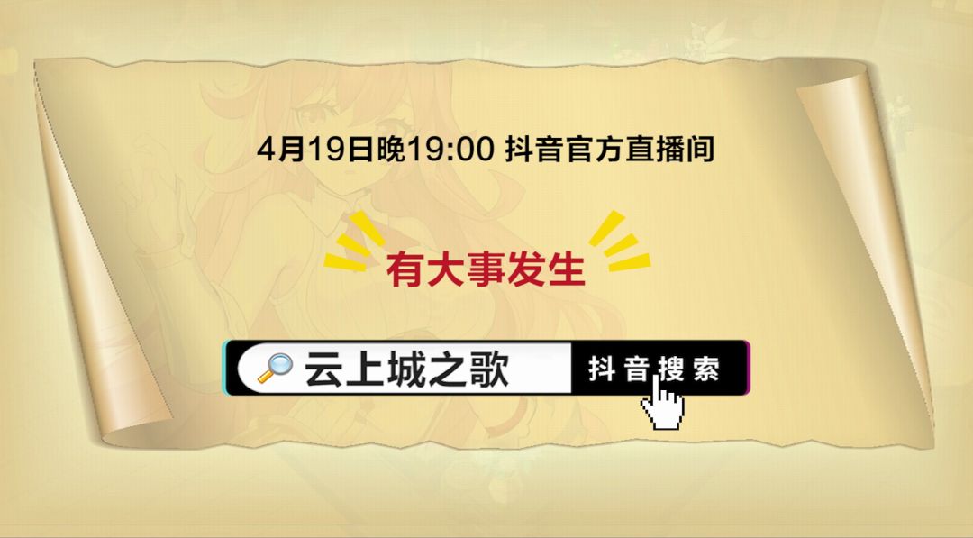 4月19日(下周二)晚上19:00锁定《云上城之歌》官方抖音直播间!策划出来直面玩家!米娜直播间狂撒礼包码!提前关注不迷路,抖音平台搜索【云上城之歌】即可观看直播!