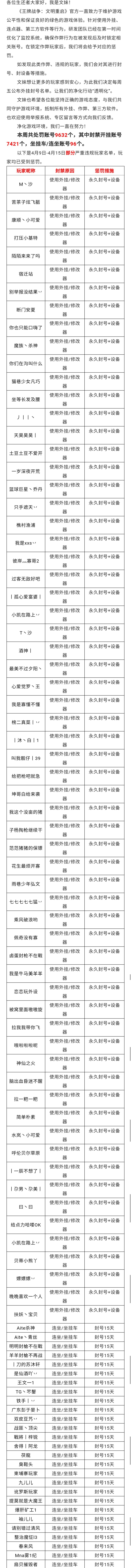 4月9日-4月15日净化游戏环境声明以及处罚公告