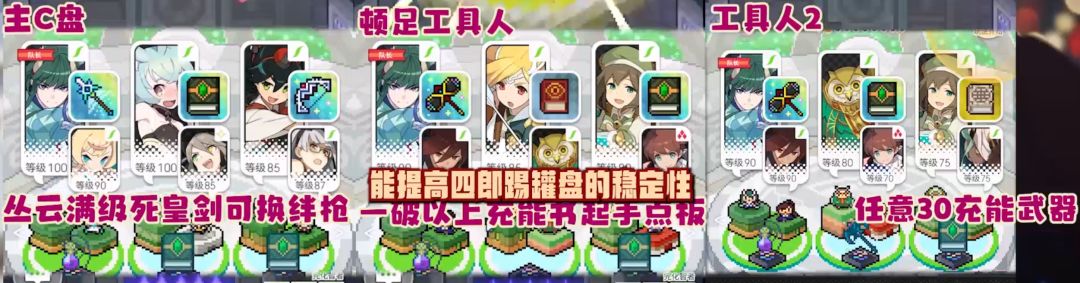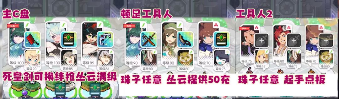这个盘子其实双人也能踢掉 但不太稳定 主盘剑鬼至少95级 丛云满级 工具人按如下构筑即可 等有雷警察之后双人踢罐工具人配置要求就可以更低