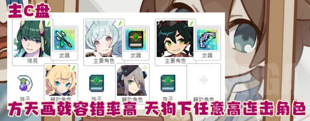 那么我们先来看看天狗小七盘子单C踢超雷的配置 目前来说三人比较稳定能踢掉 有方天画戟的话可以轻松踢掉 主盘的天狗下面副位放太母、风忍、镰鼬、蛾子等高combo角色都可以