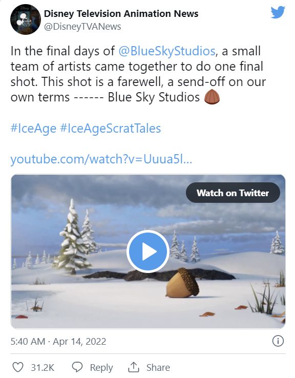 2022年4月14日,蓝天工作室的一段短片《The End》在网上流传开来。那只《冰河世纪》里的松鼠Scrat用了整整5季,终于抓到了那颗橡果。